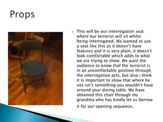 The document describes the set design and costumes for an interrogation scene in a film. It details that the interrogation seat will be plain and uncomfortable to convey the terrorist is in an unpleasant position. It also notes that the terrorist actor will wear a dirty white vest and baggy trousers to emphasize their poor treatment. The interrogator will wear an open white shirt and black trousers to seem important but unprofessional.