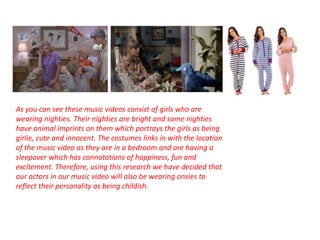 The document discusses costume choices for characters in a music video based on conventions seen in other pop music videos. It notes that girls in other videos wear bright nightgowns or onesies to appear cute and innocent. Artists typically wear shiny, colorful, short clothes to be the center of attention. Costumes also convey each character's personality, like one band member wearing something girlier than others. The music video described will feature casual clothes in one scene to match the lyrics and bright lipstick to suit the pop genre and sexualize the artist.