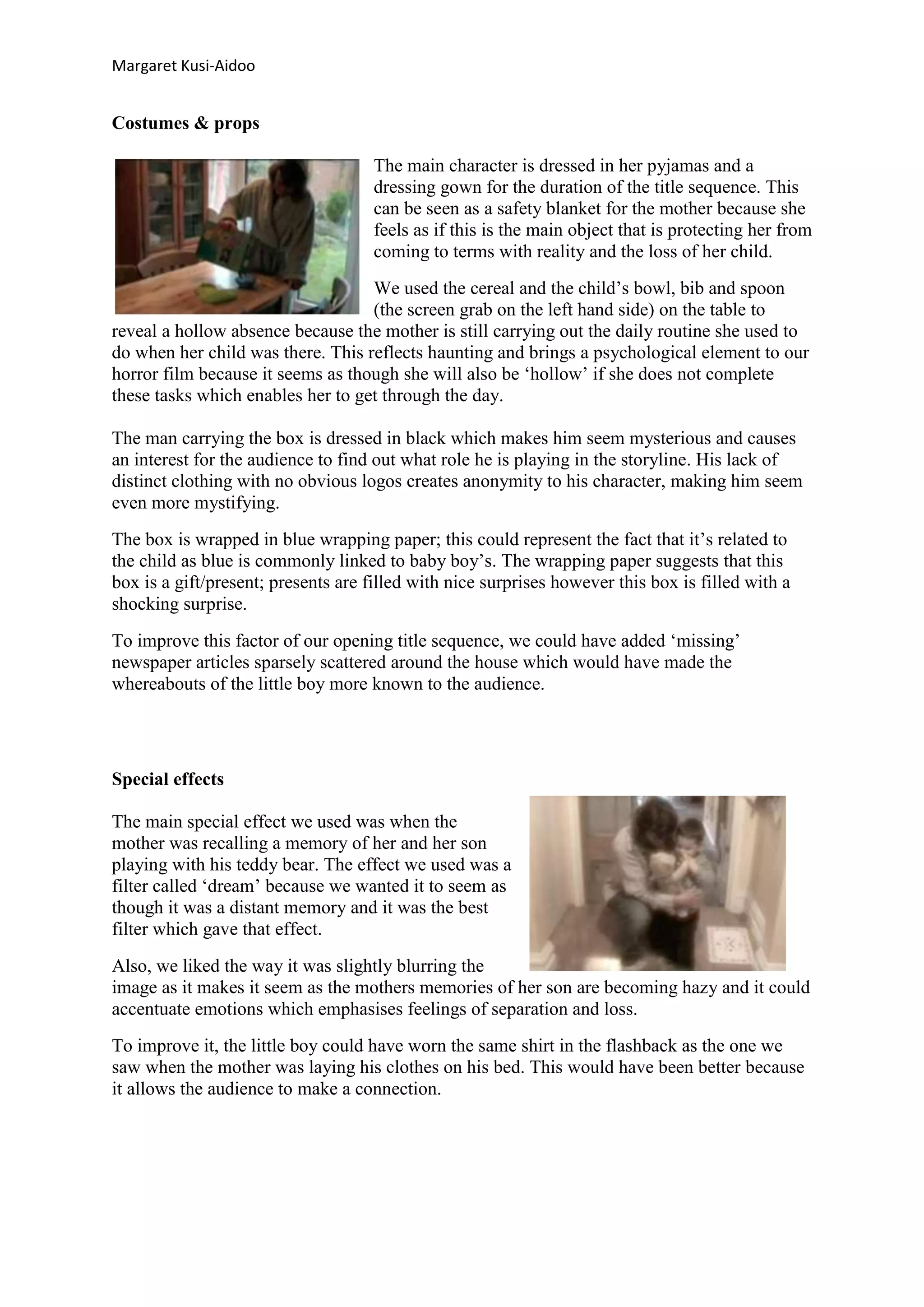 The document summarizes the costumes, props, and special effects used in the opening title sequence of a horror film. The main character wears pajamas and a robe as a "safety blanket" due to losing her child. Props like cereal and a child's bowl on the table represent her continuing daily routine despite the absence. A man in black carrying a mysterious box wrapped in blue paper could symbolize a gift related to the lost baby boy. A memory of the mother and son playing is filtered with a "dream" effect to seem distant and hazy, emphasizing emotions of loss. Using the same shirt in the flashback could better connect it to clues shown earlier.