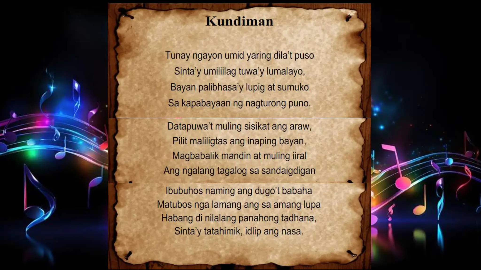 The document explores the concept of rhythmic patterns in music, emphasizing the importance of understanding beat, meter, and various musical notations such as notes and rests. It includes references to cultural elements like the kundiman, a traditional Filipino love song written by José Rizal, as well as activities designed to help students learn rhythmic patterns through group participation and problem-solving. Additionally, it addresses a character named Thalia, who struggles with understanding rhythmic patterns, encouraging collaborative solutions among classmates.