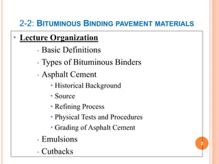 This document provides an overview of bituminous binding pavement materials, focusing on definitions, types, sources, and physical tests related to asphalt cement. It differentiates between asphalt and tar, discusses the historical usage of asphalt, and outlines the refining process and testing methods to evaluate asphalt's properties. Key topics include the types of bituminous binders, their classification, and the importance of grading asphalt for consistency in pavement construction.
