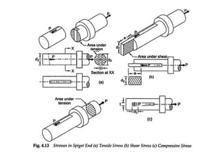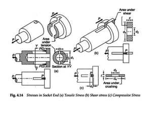 A cotter joint connects two coaxial rods subjected to axial forces. It uses a tapered wedge-shaped cotter inserted into slots in the overlapping ends of the rods. The cotter prevents longitudinal movement but allows for disassembly. Cotter joints are commonly used to connect piston rods, pump parts, flywheels, and foundation bolts. The document provides design considerations and equations for sizing the rods, slots, and cotter to withstand various failure modes from the tensile, compressive, and shear stresses based on the applied load and material properties. It also presents three example problems of designing cotter joints for specified loads.