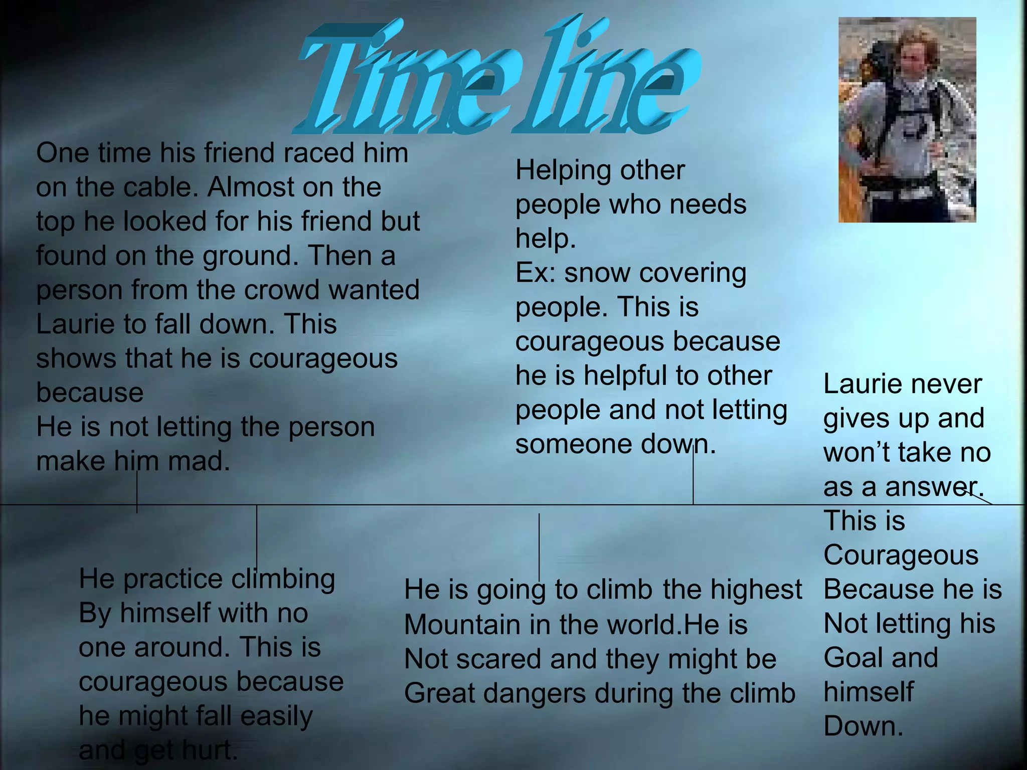 The book is about a boy named Laurie who climbs Mount Everest. It shows Laurie's courage and determination as he trains alone and faces dangers during the climb like bad weather and injuries. Even after climbing Everest, Laurie continues climbing mountains around the world, showing his bravery and adventurous spirit. The book received awards for its portrayal of Laurie's courageous adventures.
