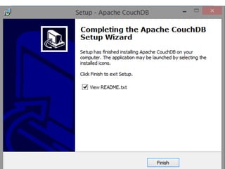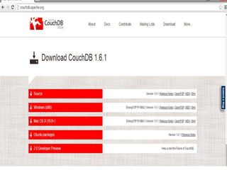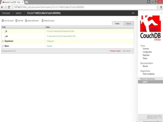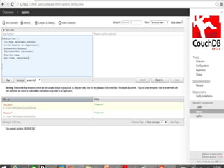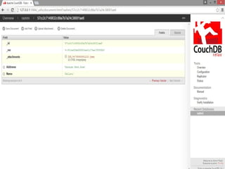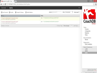 This document provides an overview of CouchDB, a document-oriented NoSQL database. It begins with an introduction comparing relational and NoSQL databases, and describing the different types of NoSQL databases. The bulk of the document then focuses on CouchDB, explaining that it is document-oriented, uses JSON documents, and features MapReduce queries, HTTP API, replication, and eventual consistency. It also provides overviews of CouchDB's architecture, how it stores documents, and related projects like PouchDB. The document concludes with screenshots of the CouchDB interface and references.