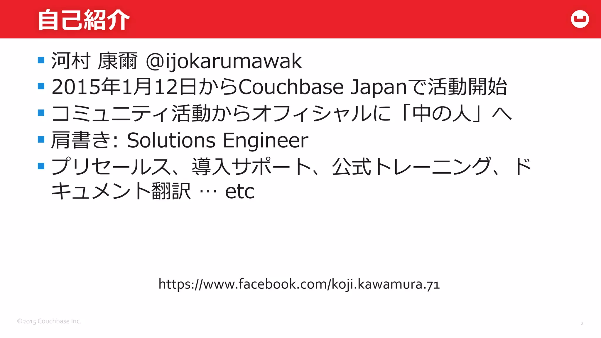 ⾃自⼰己紹介 § 河村 康爾 @ijokarumawak § 2015年年1⽉月12⽇日からCouchbase Japanで活動開始 § コミュニティ活動からオフィシャルに「中の⼈人」へ § 肩書き: Solutions Engineer § プリセールス、導⼊入サポート、公式トレーニング、ド キュメント翻訳 … etc 2 https://www.facebook.com/koji.kawamura.71