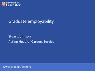 This document discusses graduate employability and outlines several national issues related to employment prospects for graduates. It notes high youth unemployment rates in the UK and references government plans to provide more information to students on employment outcomes. The document also mentions a report calling for improved access to professions and evidence provided by Leicester University on the need for employers to consider graduates from a broader range of institutions, especially those successful in social inclusion.