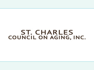 The St. Charles Council on Aging, Inc. is a non-profit organization that provides comprehensive services for seniors aged 60 and older in St. Charles Parish, Louisiana, governed by a volunteer board and advisory council. The document outlines various services offered, including transportation, meal programs, personal care, and caregiver support, all aimed at enhancing the lives of the elderly and addressing their needs. Additionally, it emphasizes equal opportunity and resource accessibility while inviting volunteers to contribute to the organization's mission.