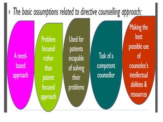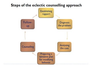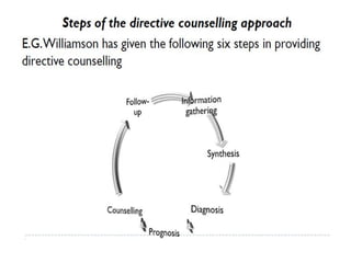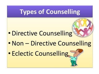 This document discusses guidance and counseling. It defines counseling as a specialized service of guidance that helps individuals learn about themselves and their present and future situations. Counseling operates at an emotional level and focuses on personal and social issues, while guidance is broader, more external, and deals with intellectual attitudes and career or education-related issues. The document outlines different counseling approaches like directive, nondirective, and eclectic counseling and discusses their characteristics, assumptions, advantages and limitations. It also describes the stages of the counseling process.
