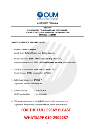 The document provides instructions for an assignment on counselling for a course on Introduction to Guidance and Counselling. Students are required to interview a school counsellor and write a proposal for the principal of a secondary school explaining the meaning of counselling, its importance in schools, current mental health issues faced by students, and recommendations for the school to address these issues. The proposal will be graded based on clarity, accuracy, understanding of counselling, references, writing style, and APA format. Students must address the meaning of counselling from various professional perspectives, discuss the importance and approaches of counselling in schools, provide evidence on mental health issues faced by students from journal articles and news reports, and give three recommendations for the school.
