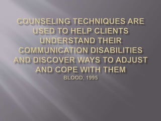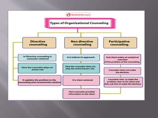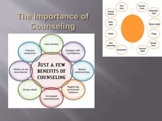 Counseling involves the mutual exploration of ideas, attitudes, and feelings between a counselor and client to address misperceptions, emotional overlays affecting self-concept, and disparities between thoughts and feelings. Effective counseling distinguishes between guidance, counseling, and psychotherapy. A counselor should rarely solve problems for the client but instead guide them to their own solutions, trust intuition, and provide direction while protecting feelings and allowing the client to progress at their own pace. Counseling from trained professionals can profoundly impact individuals, families and communities by helping people navigate difficult life situations.