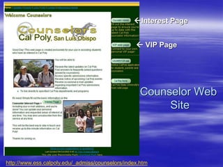 The document discusses various secondary market contact tools for an admissions and recruitment program at Cal Poly, including: 1) A counselor website with interest and VIP pages for individualized content; 2) A counselor conference registration form pre-populated from interest page data; 3) Ability to create specialized surveys and send group emails tailored for secondary contacts. It also mentions tools for scheduling campus tours, registering for tours, emailing about college fairs and school visits, and promoting a CSU counselor conference.