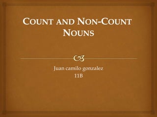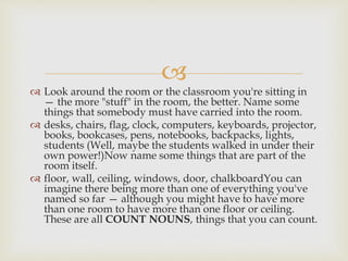 The document discusses count nouns and mass nouns. It provides examples of count nouns, which can be pluralized and preceded by articles, as things that can be counted like desks, chairs, books. In contrast, it lists mass nouns like wood, ice, air, water as things that cannot be counted or made plural since they are substances rather than discrete objects. The document also includes several links to exercises and resources for learning more about count and mass nouns.
