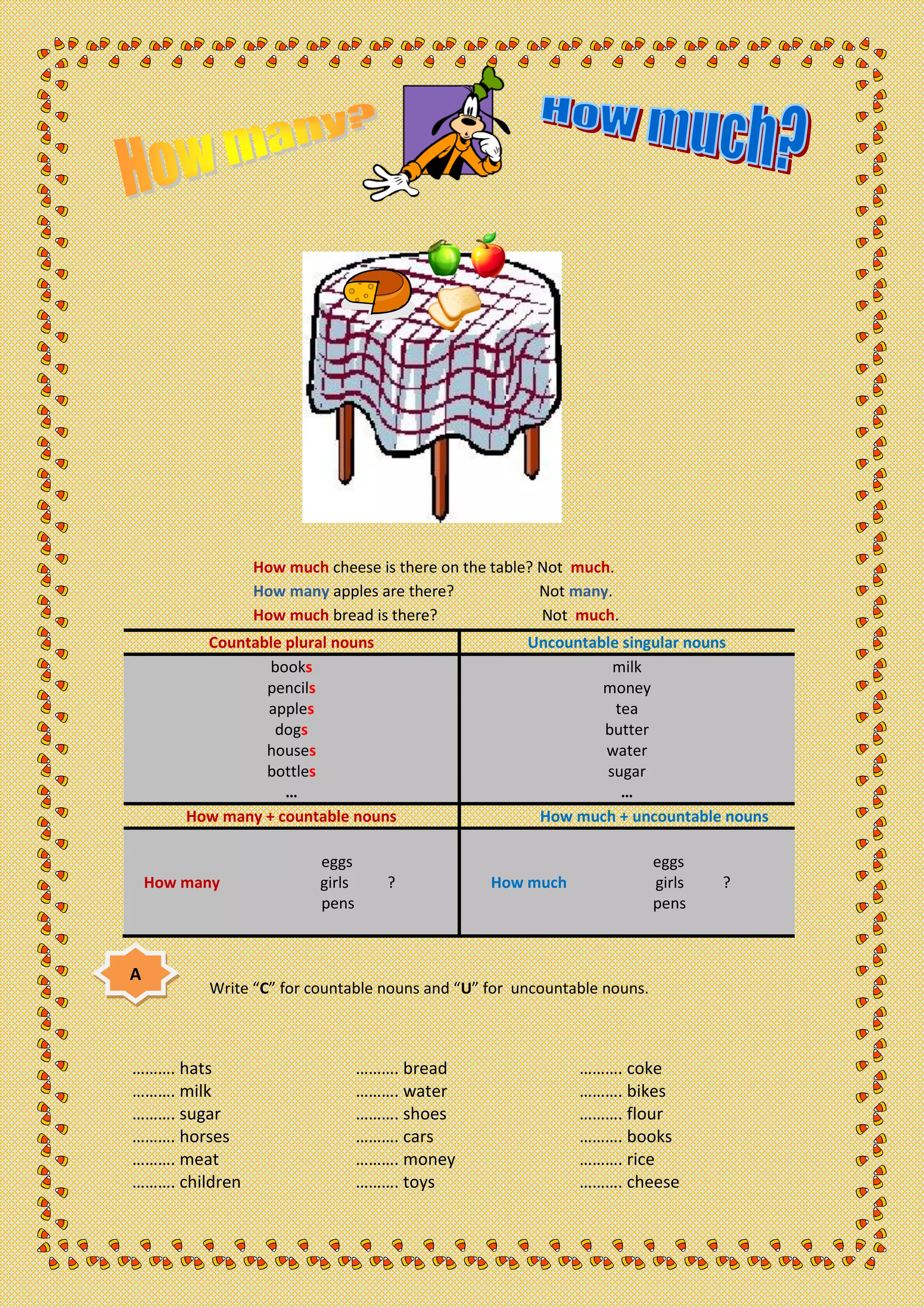 The document discusses the difference between countable and uncountable nouns. It provides examples of questions using "how many" with countable nouns like books, pencils, and apples. It also gives examples using "how much" with uncountable nouns like milk, money, and tea. The document then has exercises for the reader to identify nouns as countable or uncountable and to fill in whether "how many" or "how much" should be used in sample questions.