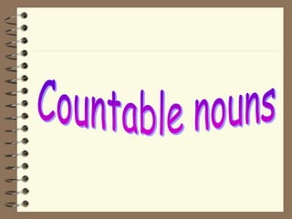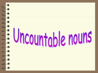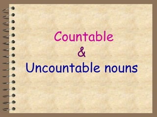 This document summarizes the difference between countable and uncountable nouns. Countable nouns can be singular or plural, and refer to things that can be counted, like apples. Uncountable nouns only have one form and refer to things that cannot be counted, like rice. The document provides examples of countable and uncountable nouns and explains that we use "there is some" with uncountable nouns and "there are some" with plural countable nouns.