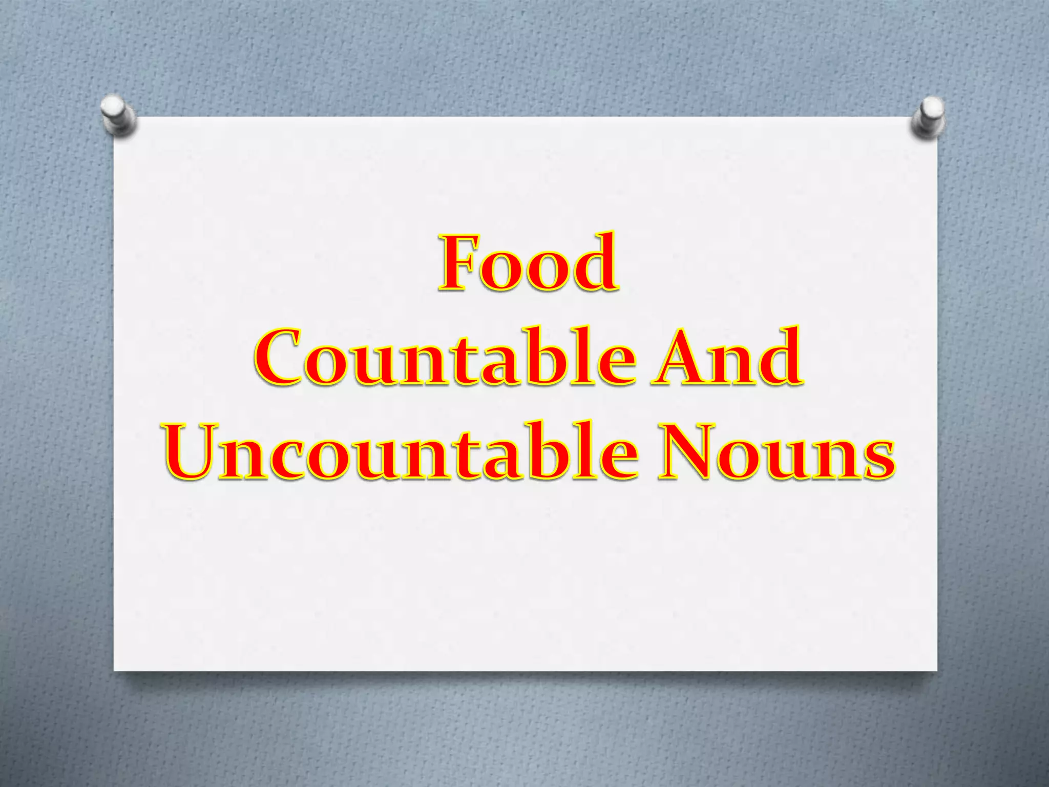 The document discusses countable and uncountable nouns. Countable nouns refer to objects that can be counted individually, like apples or chairs. They have both singular and plural forms. Uncountable nouns refer to substances or abstract concepts that cannot be counted, like pasta, sugar or news. They only have a singular form. However, uncountable nouns can sometimes be used in a countable way when referring to a specific quantity or container of the substance.