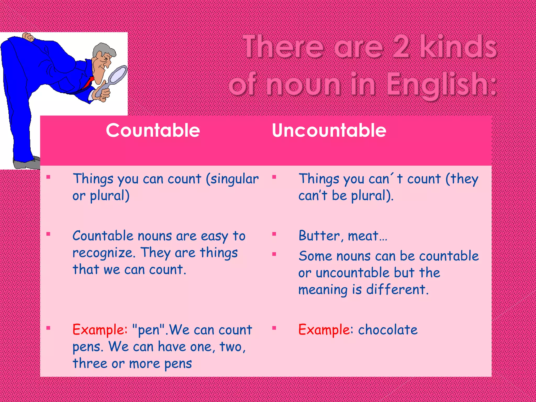 The document explains the distinction between countable and uncountable nouns, providing definitions, examples, and grammatical rules for their usage. It highlights how countable nouns can be quantified while uncountable nouns represent substances or concepts that cannot be counted individually. Additionally, it notes that some nouns can function as both countable and uncountable depending on context.
