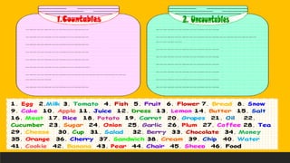 The document discusses countable and uncountable nouns. Countable nouns can be pluralized and take the indefinite article "a" or "an", while uncountable nouns cannot be counted, may refer to substances or concepts, are used with singular verbs, and take quantifiers like "some" or "any" rather than articles. Examples of each type of noun are provided. The document also provides corrections for sample sentences containing countable/uncountable noun errors and discusses the use of definite and indefinite articles.