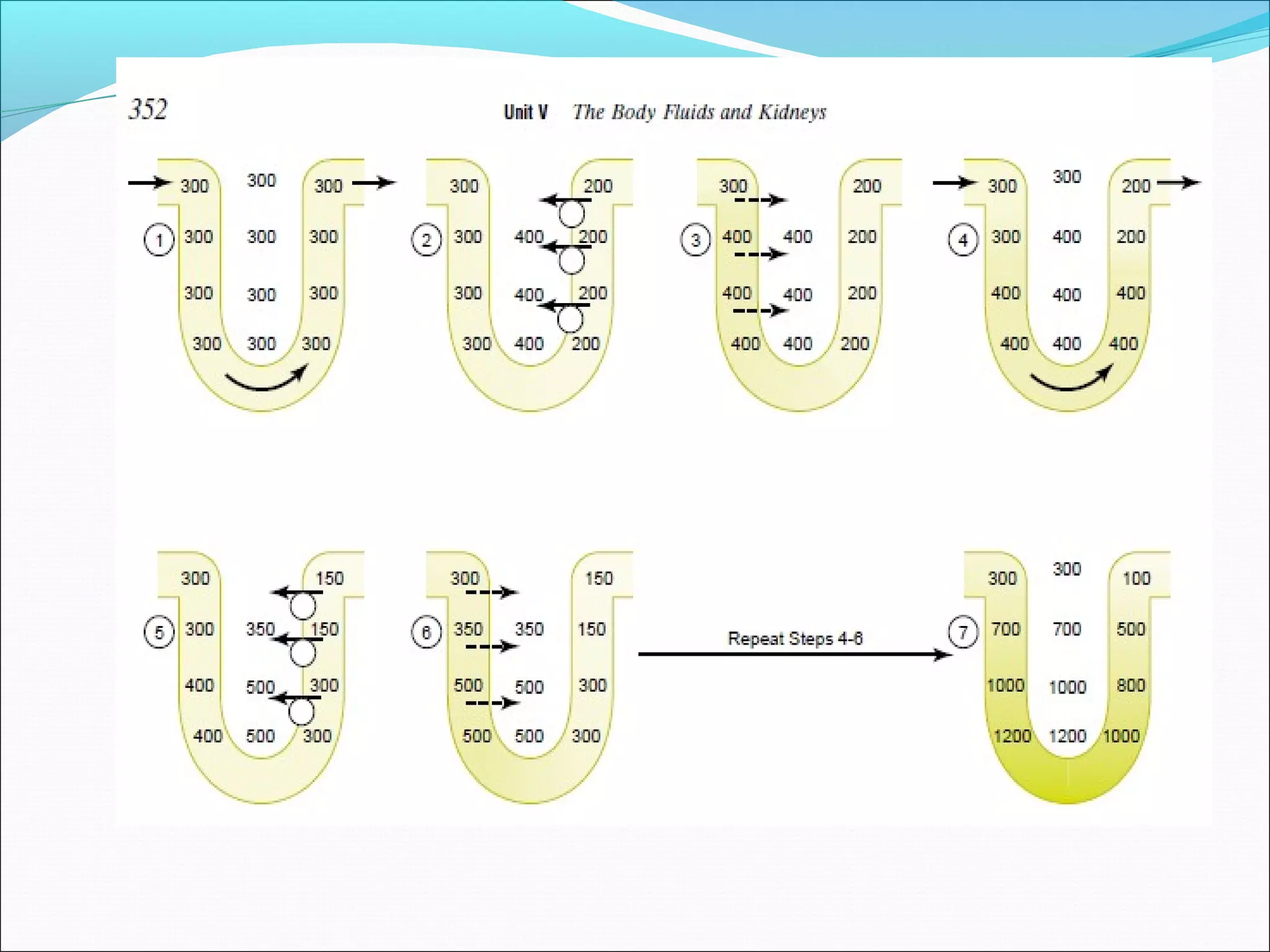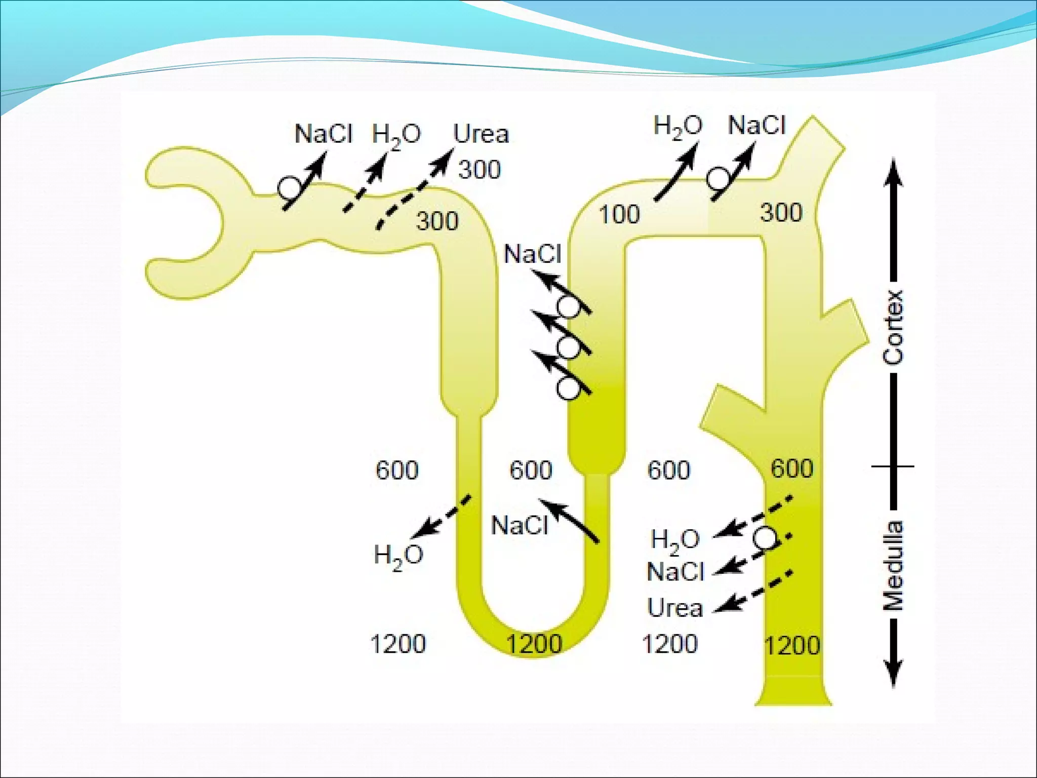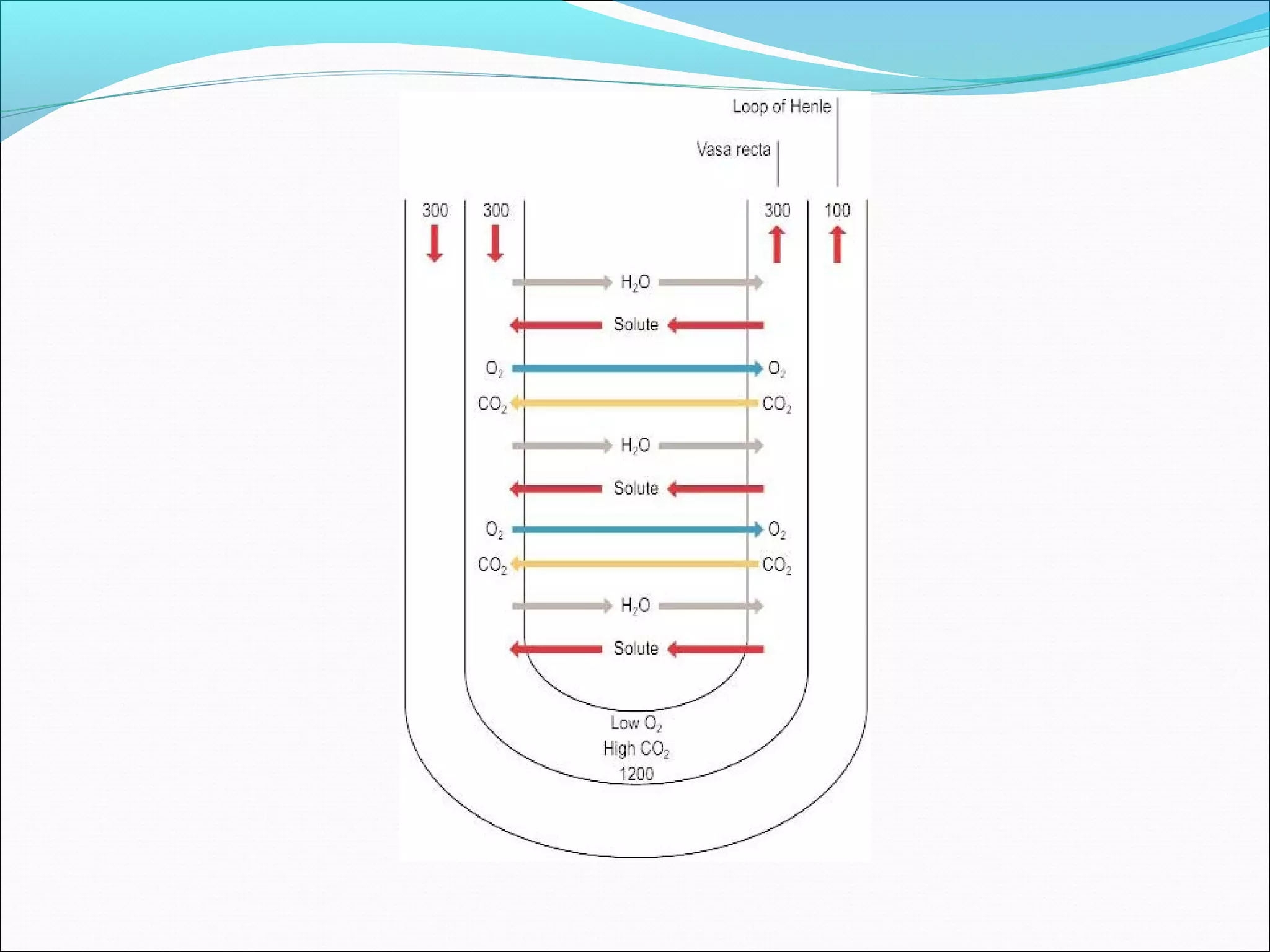 The countercurrent mechanism in the kidney produces a hyperosmotic renal medullary interstitium through three key processes: 1) the countercurrent multiplier effect of the thick ascending loop of Henle which repetitively reabsorbs sodium chloride, 2) active transport of ions from the collecting ducts into the medullary interstitium, and 3) facilitated diffusion of urea from the inner medullary collecting ducts into the medullary interstitium. This hyperosmotic interstitium is maintained by the countercurrent exchange function of the vasa recta blood vessels.