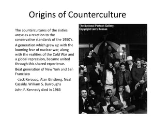 The document summarizes the counterculture movement of the 1960s, its origins as a reaction to 1950s conservatism, and its evolution over the decade. Key events included the emergence of the New Left focusing on civil rights and opposing the Vietnam War, widespread student and labor protests in the US and Europe, and the rise of feminism and environmentalism. LSD played a large role in art and music but its popularity declined after the deaths of prominent figures. In 1968, protests escalated with Martin Luther King and Robert Kennedy's assassinations and riots at the Democratic National Convention. The May 1968 student strike in France had wide impacts and signified the peak of the global protest movement. New media like independent newspapers and the