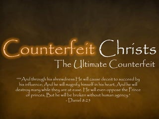 This document provides an overview of false prophets and the biblical antichrist known as the beast. It discusses how various historical figures and religions have prepared the way for the eventual rise of the antichrist by promoting the deification or divinity of mankind. The antichrist is traced through several Old Testament prophecies in Daniel and Revelation and is described as opposing God, demanding worldwide worship, and persecuting believers before being defeated by Christ at His return.