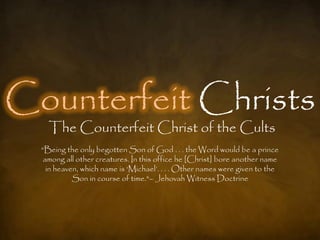 The document examines various groups, including Mormons and Jehovah's Witnesses, that present counterfeit versions of Jesus Christ and salvation. It highlights key beliefs of these groups that contradict historic Christian doctrines, particularly concerning the nature of Jesus and the sufficiency of his sacrifice. Furthermore, it emphasizes the importance of recognizing the complete divinity of Christ and the adequacy of his atoning death for salvation.