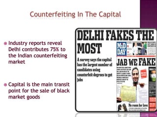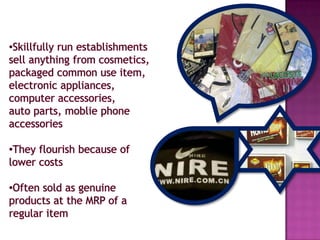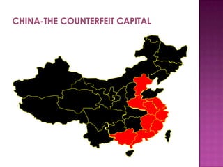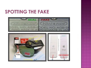 The document discusses counterfeit goods and defines a counterfeit as an unauthorized copy that is not produced by the original manufacturer and does not meet their design and quality standards. It notes that the spread of counterfeit goods, particularly fashion items, has grown significantly globally. Authorities expect counterfeiting to remain high for the next six years, with 20% of athletic merchandise estimated to be counterfeit. The counterfeit industry is clustered in certain regions of China known for illicit production.