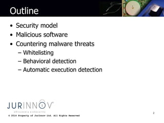 The document discusses strategies for combating malware threats, emphasizing the need for adaptable security models and various detection approaches like whitelisting and behavioral detection. It highlights the challenges posed by malicious software, including its increasing sophistication and ability to evade traditional security measures. Additionally, it addresses the trade-offs between security effectiveness and system performance, and provides insights into automatic execution detection as a complementary strategy.