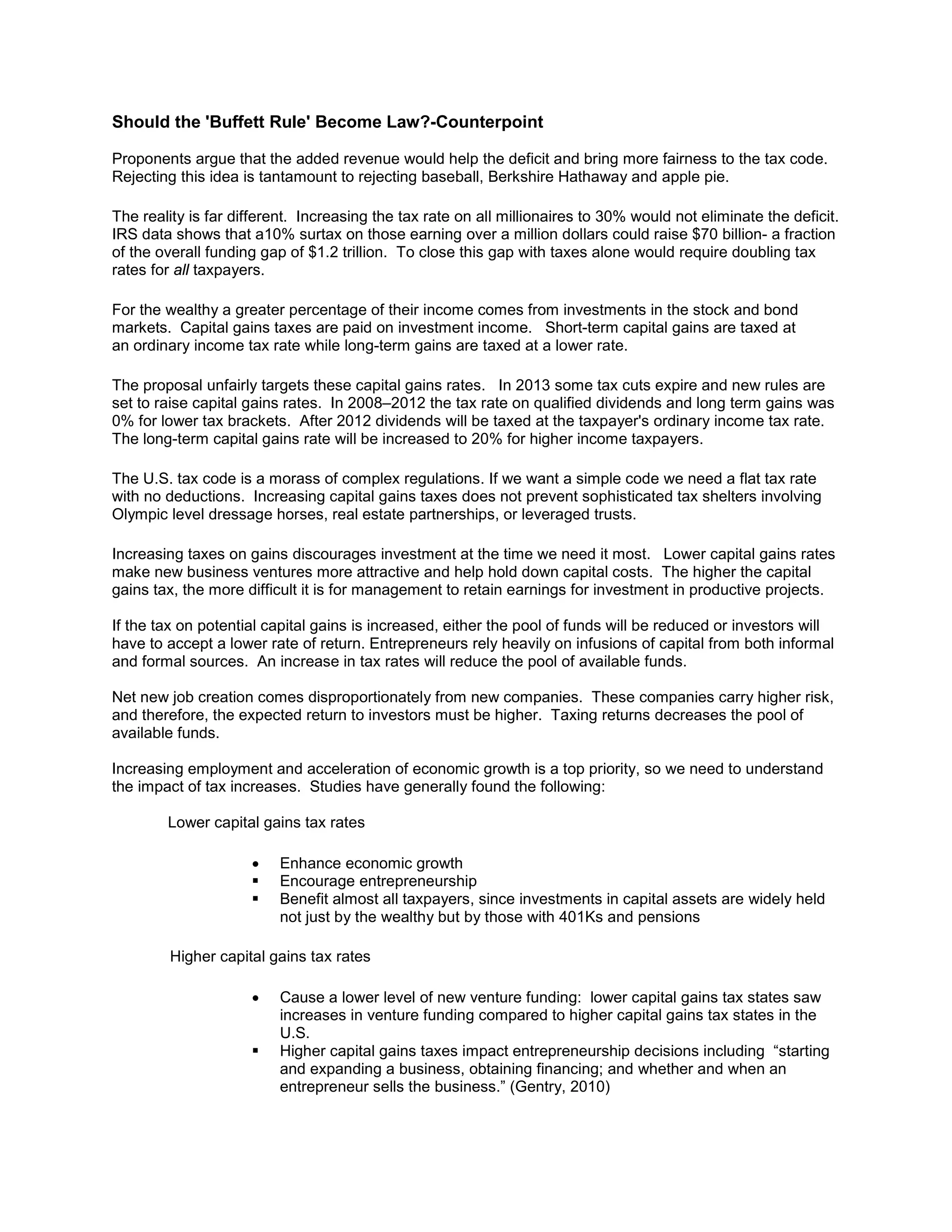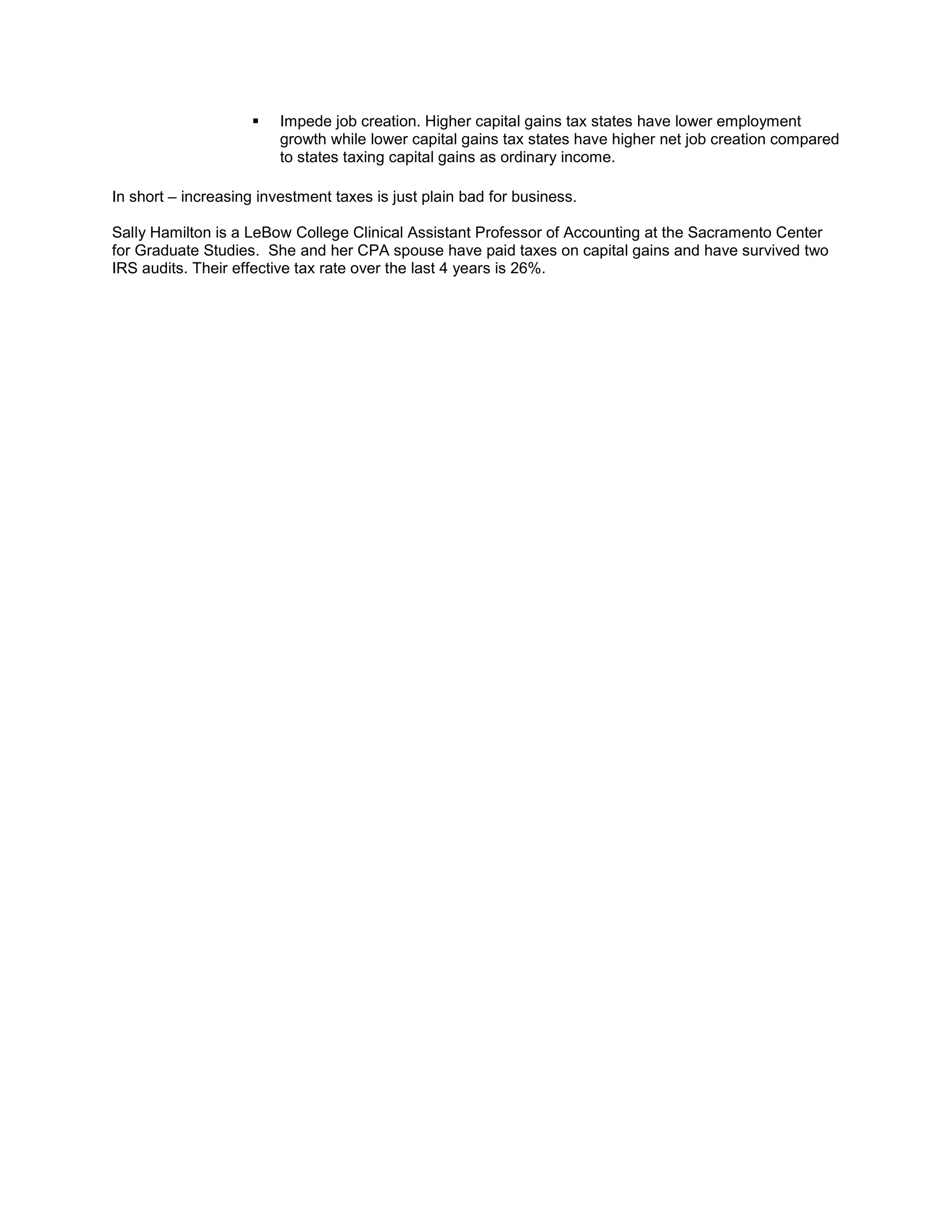 Increasing capital gains taxes would discourage investment when it is most needed to spur economic growth and job creation. [1] Studies have found that lower capital gains tax rates enhance economic growth and encourage entrepreneurship, benefiting all taxpayers with investments. [2] Higher capital gains tax rates cause lower levels of new venture funding and impact entrepreneurship decisions, which can impede job creation. [3] In short, increasing investment taxes is counterproductive for business and the economy.