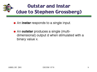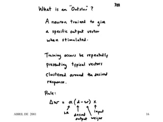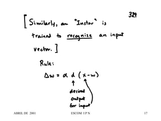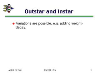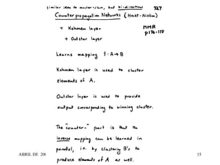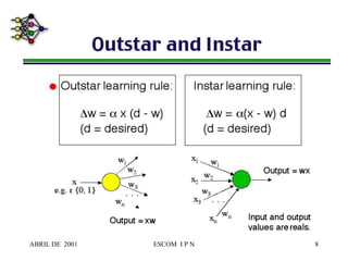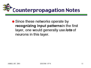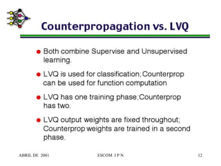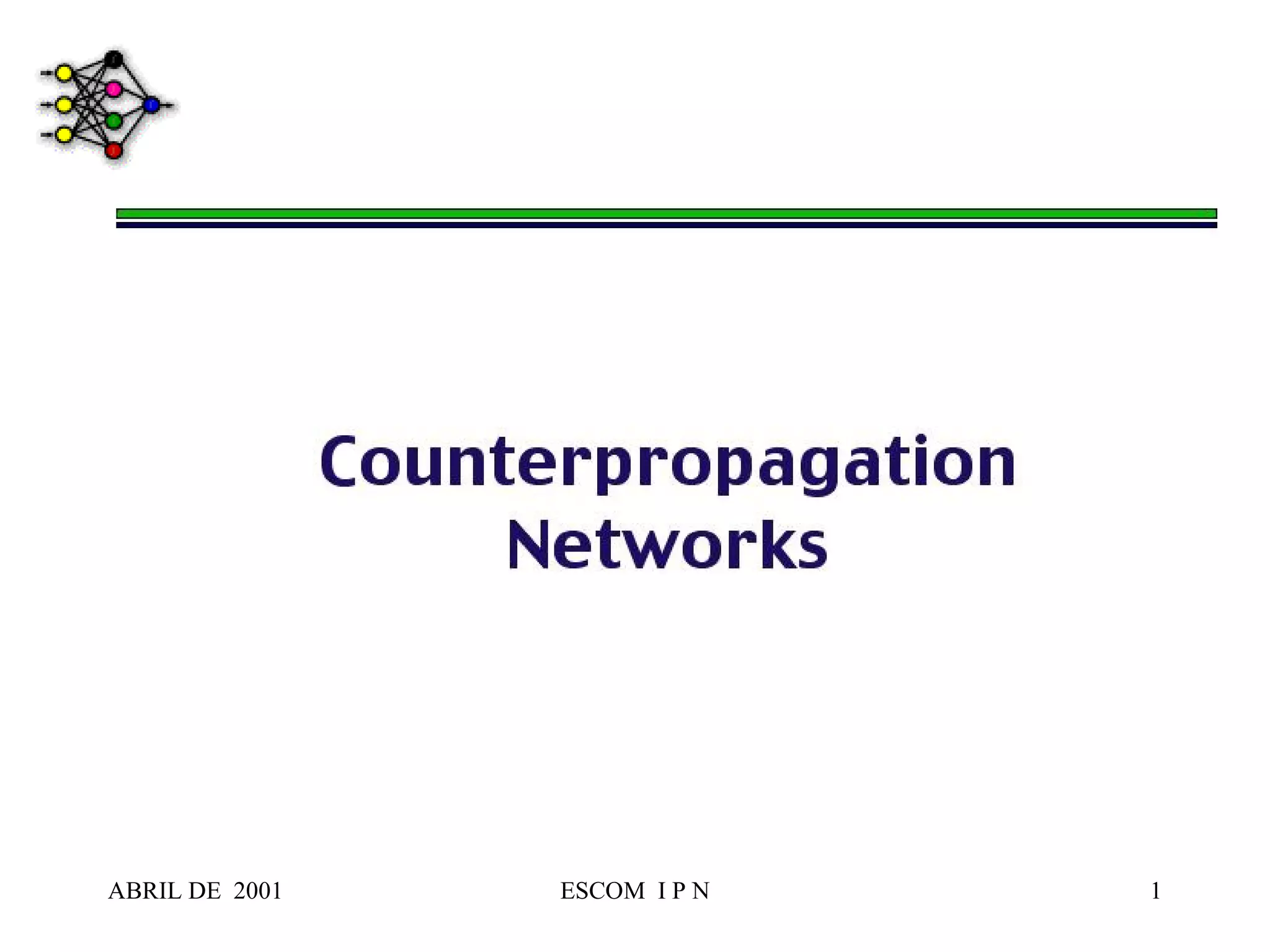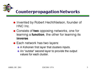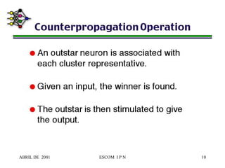 The CounterPropagation algorithm updates a neural network with an input, hidden, and output layer. It identifies the hidden neuron with the highest input, setting its activation to 1 and others to 0. The output is then calculated as the weighted sum of the hidden neuron, equal to the weight of the link between the winner hidden neuron and the output neurons. This update works with the CounterPropagation learning function to train the network.