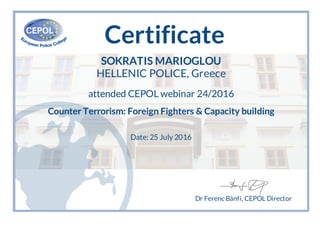 This certificate confirms that Sokratis Marioglou of the Hellenic Police in Greece attended a CEPOL webinar on July 25, 2016 about counter terrorism and foreign fighters. The webinar introduced Europol's role in fighting foreign fighters and building counterterrorism capacities, and discussed CEPOL's project to build counterterrorism capacities in the Middle East and North Africa region. The webinar aimed to benefit law enforcement communities in the EU and was organized by the European Union Agency for Law Enforcement Training.
