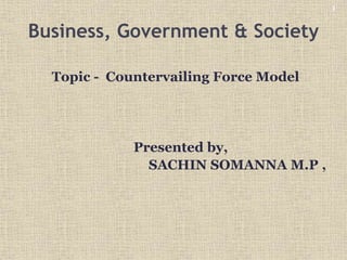 The countervailing forces model shows the flows of influence between corporations, government, the public, and environmental factors. It depicts a system where the power of businesses is checked by responses from government to public values and demands. The model outlines how economic conditions, markets, ideologies, technology, nature, and culture can influence corporations, the public, and government. Government in turn regulates corporations through statutes and policies.
