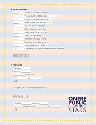 The document is a song lyric worksheet that provides exercises to correct, complete, reorder, match and fill in the blanks for the lyrics of the song "Counting Stars" by OneRepublic. The summary focuses on the overall task of completing various exercises to fully form the song lyrics through making corrections, additions, reorderings and matching parts of the lyrics.