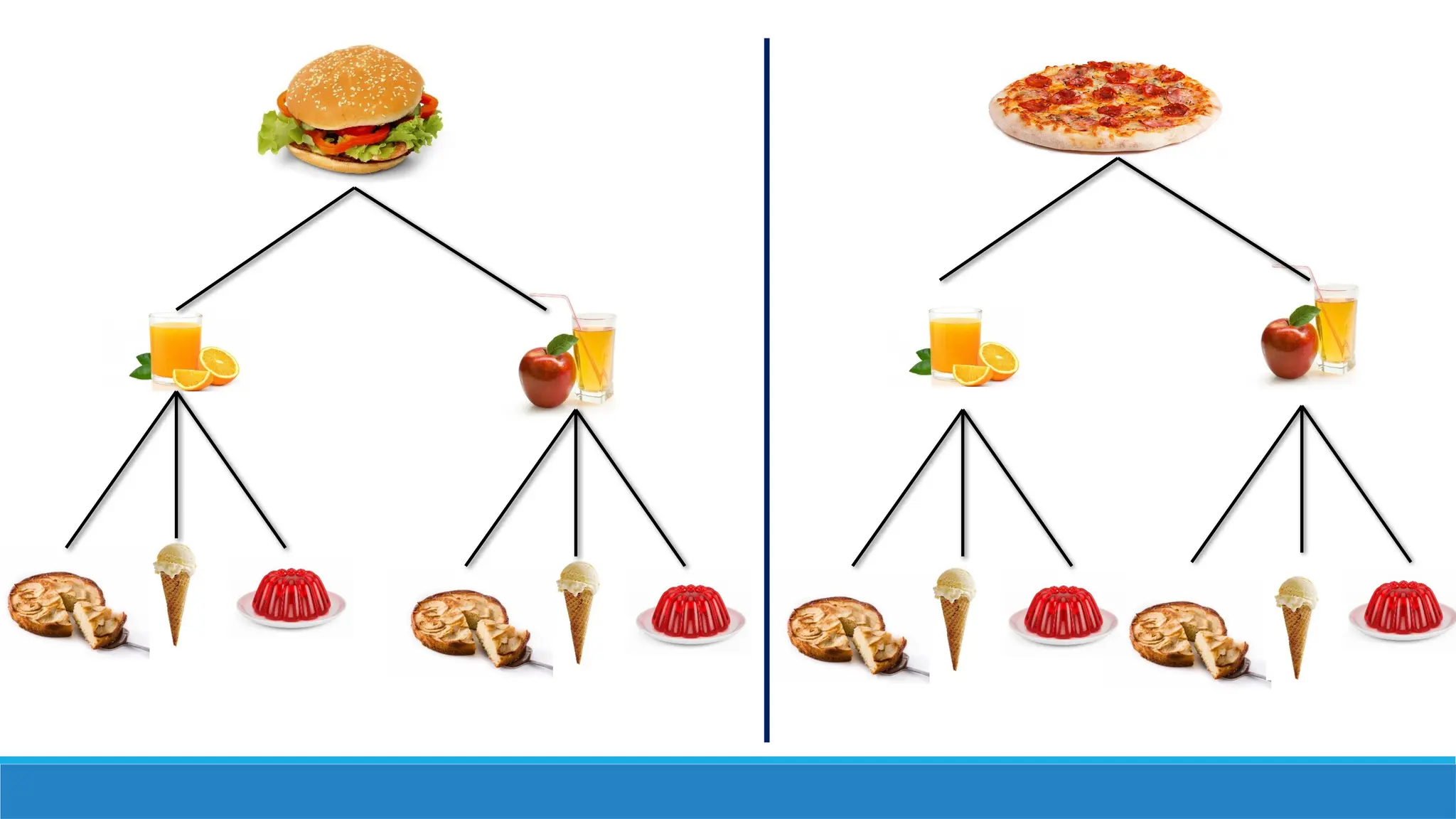 (orange juice, apple juice) and three choices of dessert (pie,