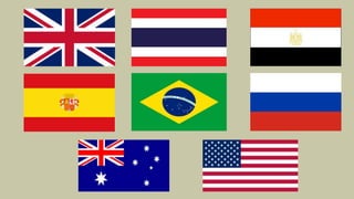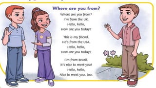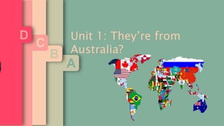 This document contains information about where different people are from, including examples of short forms used to indicate locations. It introduces vocabulary words for different countries like the UK, Russia, Brazil, Egypt, the USA, Australia, Thailand, and Spain. It provides examples of asking and answering questions about where someone is from using short forms like "We're" and "She's". It also includes exercises for learners to practice asking and answering questions about hypothetical people and their origins.