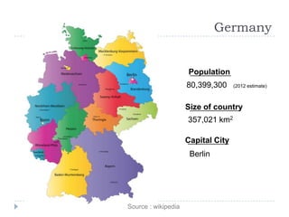 The document provides an analysis of Germany, detailing its demographics, education system, political landscape, and economic status, including the impact of Angela Merkel's leadership. Key statistics include a population of approximately 80.4 million, a GDP per capita of USD 41,354, and an unemployment rate of 5.5% in 2012. It also highlights Germany's role in the European Central Bank and its economic ties with France and other European nations.