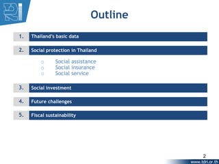 3) Future challenges include expanding coverage of benefits and improving benefit levels given Thailand's aging population and increasing burden on the healthcare system. Fiscal sustainability of social protection programs is also a concern.