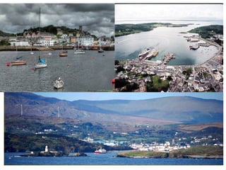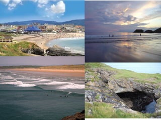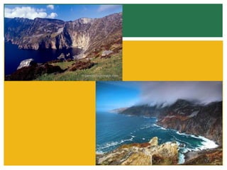 County Donegal contains several notable natural landmarks and attractions. Slieve League contains the sixth highest sea cliffs in Europe that are over 600 meters high, offering scenic views of Donegal Bay. Ards Forest Park features forest trails and historic sites amongst sandy beaches and rivers. Killybegs is the largest fishing port in Ireland and a center for fishing and processing industries, located on a scenic harbor. Bundoran Beach is a popular surfing destination on Donegal Bay, known for its sea stacks and cliff walks. Glenveagh National Park features natural landscapes and woodlands surrounding a Scottish castle, home to Ireland's largest herd of red deer.