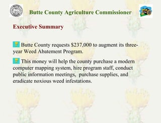 Butte County is requesting $237,000 to augment its three-year Weed Abatement Program to purchase a GIS mapping system, hire staff, conduct outreach, and eradicate noxious weeds. The funds would support salaries for a GIS analyst, technician, and field technicians, as well as equipment like a computer, plotter, and GPS. The program aims to map and remove over 200 weed infestations across the county's difficult terrain to protect agriculture, wildlife, and human health. The county will contribute over $313,000 in additional funding, equipment, and volunteer labor to fully implement the three-year program.