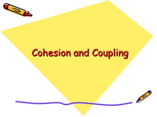 This document discusses the Think Pair Share activity and principles of cohesion and coupling in software design. It provides definitions and examples of different types of coupling (data, stamp, control, etc.) and levels of cohesion (functional, sequential, communicational, etc.). The key goals are to minimize coupling between modules to reduce dependencies, and maximize cohesion so elements within a module are strongly related and focused on a single task. High cohesion and low coupling lead to components that are more independent, flexible, and maintainable.