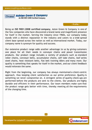 Ashton Green & Company is an ISO 9001:2008 certified manufacturer and exporter specializing in power transmission products and conveyor chains, with a strong presence in both national and international markets since the 1960s. The company offers a wide range of high-quality products such as standard roller chains, pulleys, and conveyor systems, focusing on client satisfaction and durability. With a commitment to stringent quality checks and continuous improvement, Ashton Green & Company aims to meet evolving customer needs while maintaining a robust reputation for quality and success.