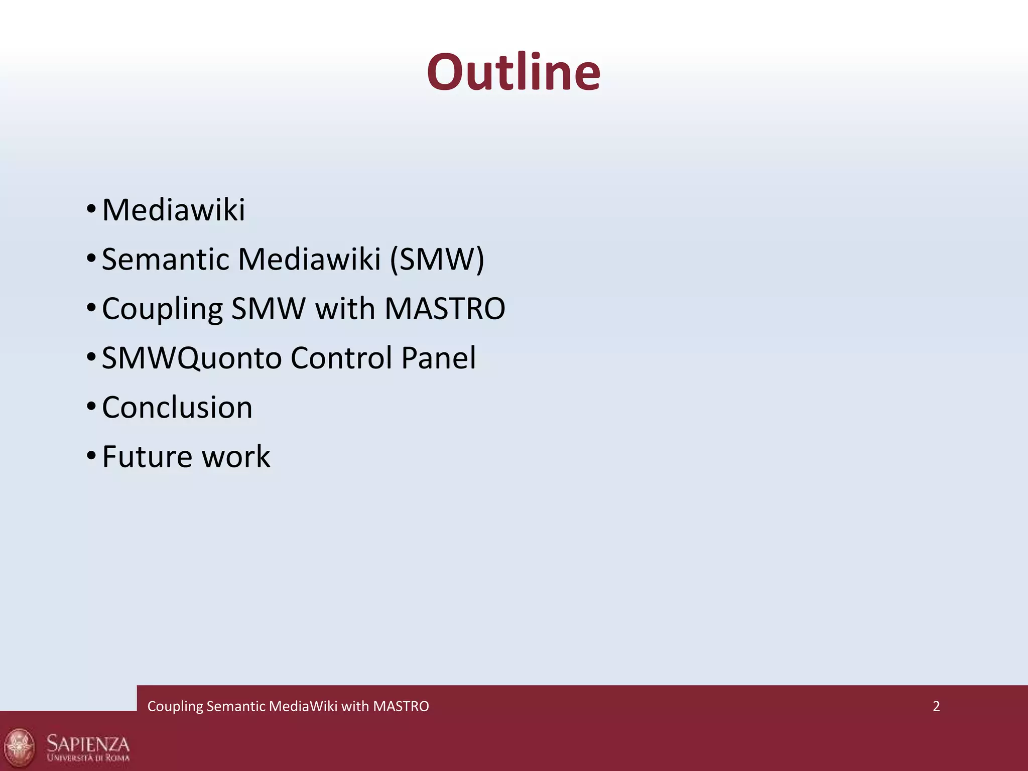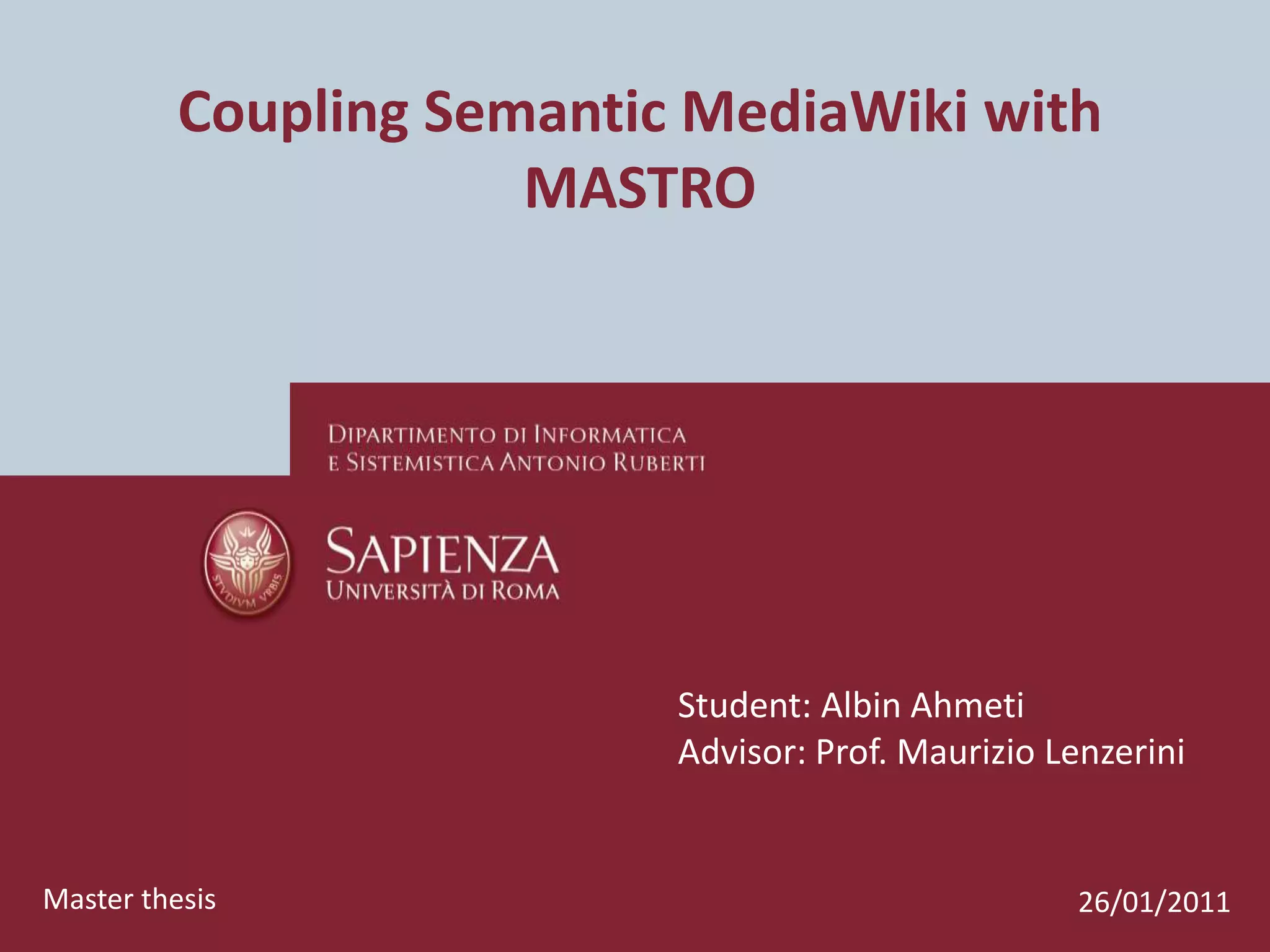 This document discusses coupling Semantic MediaWiki (SMW) with MASTRO to add more expressivity to SMW while maintaining polynomial reasoning times. SMW is augmented with DL-Lite constructs like disjoint classes and properties. Queries in SMW are translated to union of conjunctive queries (UCQs) for evaluation in MASTRO. A control panel manages the semantic data exchange between SMW and MASTRO's knowledge base. Future work includes using a more scalable coupling and SparSQL to handle additional SMW query features.