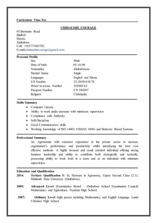 This curriculum vitae is for Chidaushe Courage, a Zimbabwean agronomist currently working as a stock controller for Windmill Private Limited. He has a B.Sc. Honours degree in Agronomy from Midlands State University and over 8 years of work experience in agriculture. His responsibilities in his current role include customer consultation, stock control, and maintaining health, safety, and environmental standards. He has strong computer skills and experience conducting research and training. References are provided from his current and previous employers who can speak to his qualifications and job performance.