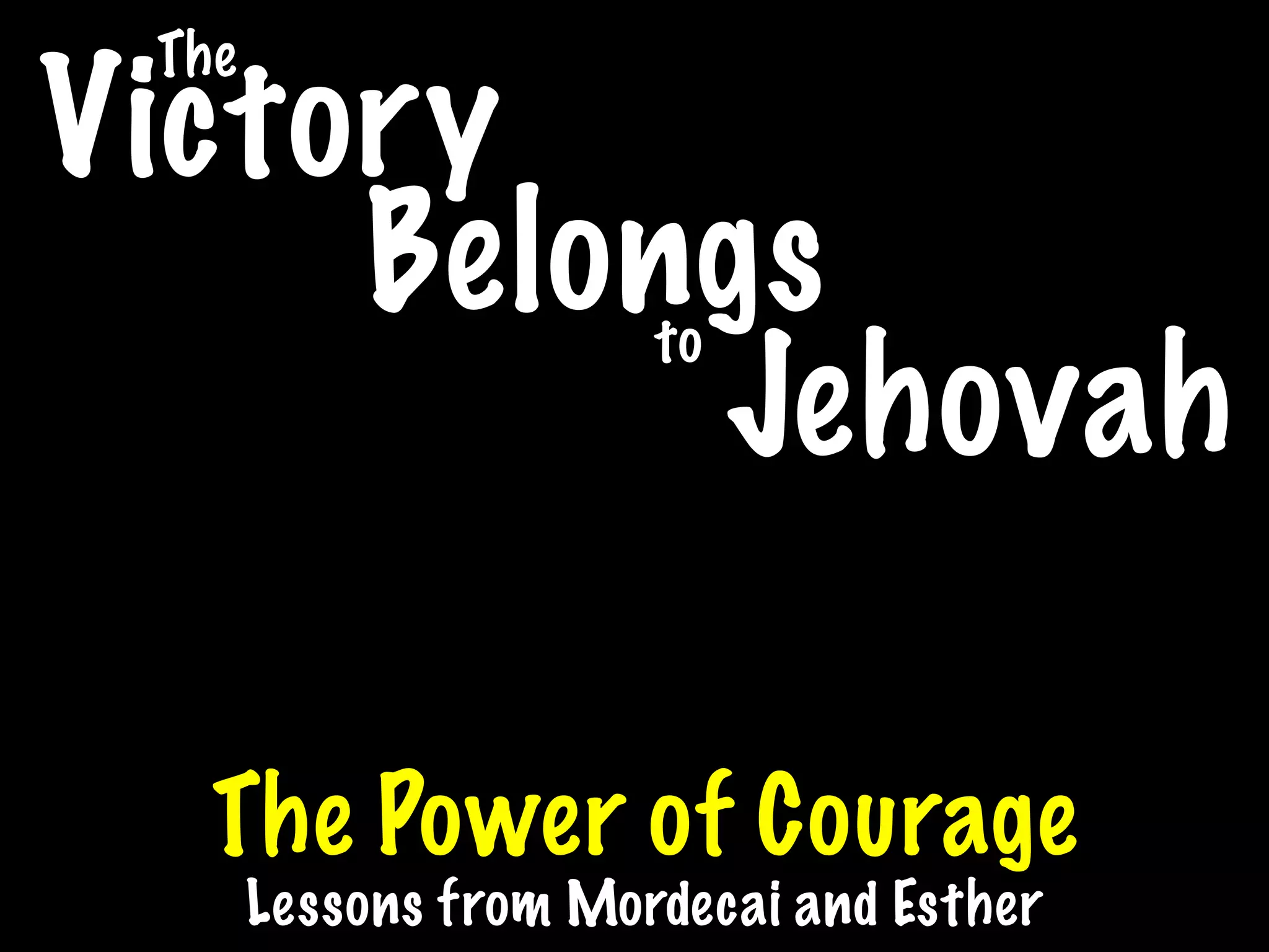 This document summarizes lessons on courage from the biblical story of Mordecai and Esther. It discusses how Mordecai courageously chose to save the king and refused to bow to Haman, knowing when the opportune moment had come. It describes how Esther courageously agreed to see the king without being summoned, fasted on behalf of her people, and boldly confronted Haman, saying "If I perish, I perish." The document concludes that those with courage will be moral, wise, and find victory, as exemplified by Mordecai and Esther.