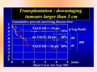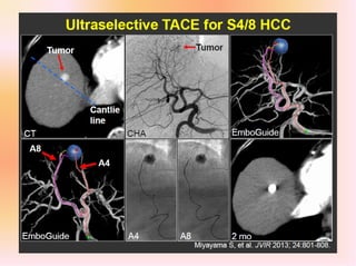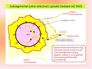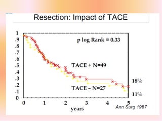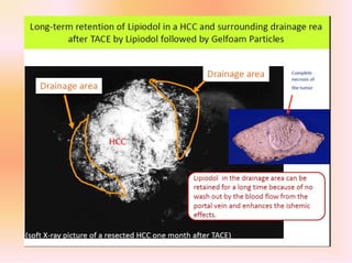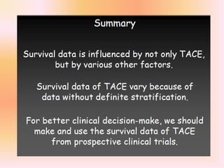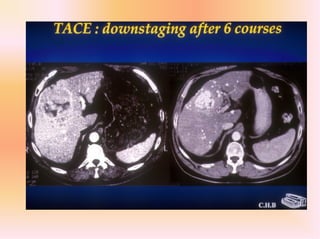 Trans Arterial Chemo Embolisation (TACE) is a treatment for Hepatocellular Carcinoma (HCC) where an anticancer agent is mixed with an embolic agent and delivered via the hepatic artery. Early studies showed improved survival rates for TACE-treated HCC patients compared to controls. Patient selection is important, as TACE is best for patients with preserved liver function. More recently, techniques have improved such as using drug-eluting beads and performing highly selective TACE of tumor-feeding arteries to minimize liver damage while maximizing tumor exposure. Ongoing research continues to refine TACE as a key treatment option for HCC.