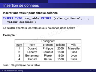 Le document présente des instructions sur l'insertion, la suppression et la modification de données dans un système de gestion de base de données (SGBD) utilisant le langage SQL. Il explique notamment comment insérer des valeurs dans des tables, supprimer des tuples selon des conditions, et mettre à jour des enregistrements spécifiques. Des exemples pratiques sont fournis pour illustrer chaque opération.
