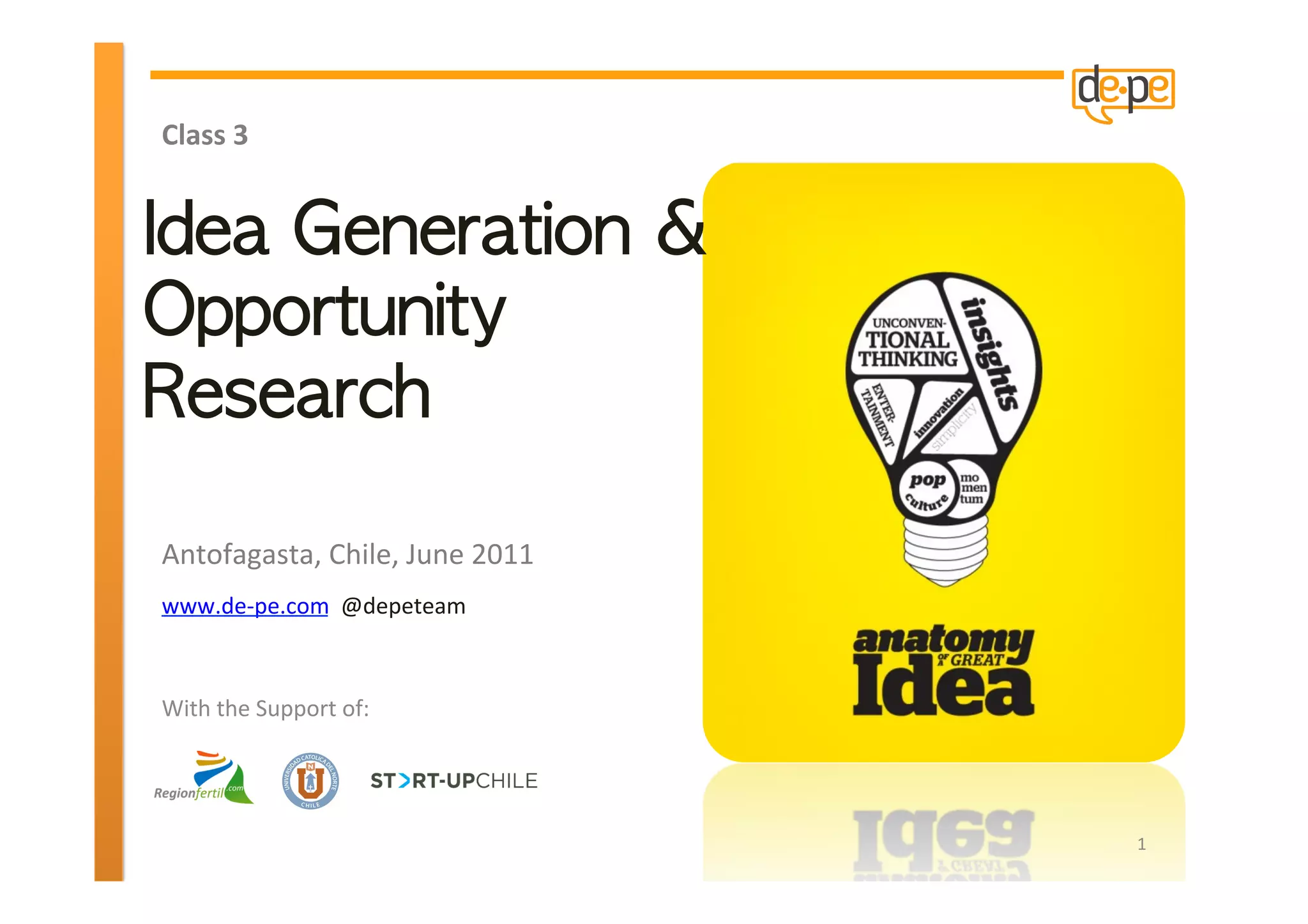 The document provides guidance on generating new startup ideas. It discusses that coming up with ideas is difficult but that the best way is to generate a lot of ideas. It then covers various idea generation techniques like brainstorming, looking for problems to solve, observing what exists that could be improved, and leveraging new technologies. The document emphasizes starting with a problem rather than randomness and finding problems people feel strongly need a solution. It also notes that some of the most successful startups began accidentally by solving unrelated problems.