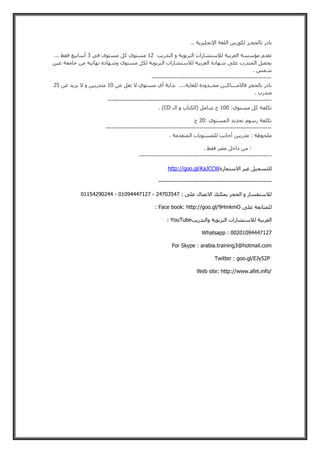 تقدم مؤسسة التدريبات التربوية للإستشارات العربية كورس مخصص لتعليم اللغة الإنجليزية يتكون من 21 مستوى، حيث يحصل المتدرب على شهادة معتمدة من جامعة شمس. الأماكن متاحة بشكل محدود، ويجب على المتدربين الحجز مسبقاً بسبب الحد الأقصى للمتدربين في المستوى الواحد. كما يمكن التسجيل والاستفسار عبر الرابط المرفق أو عبر وسائل التواصل المختلفة المذكورة.