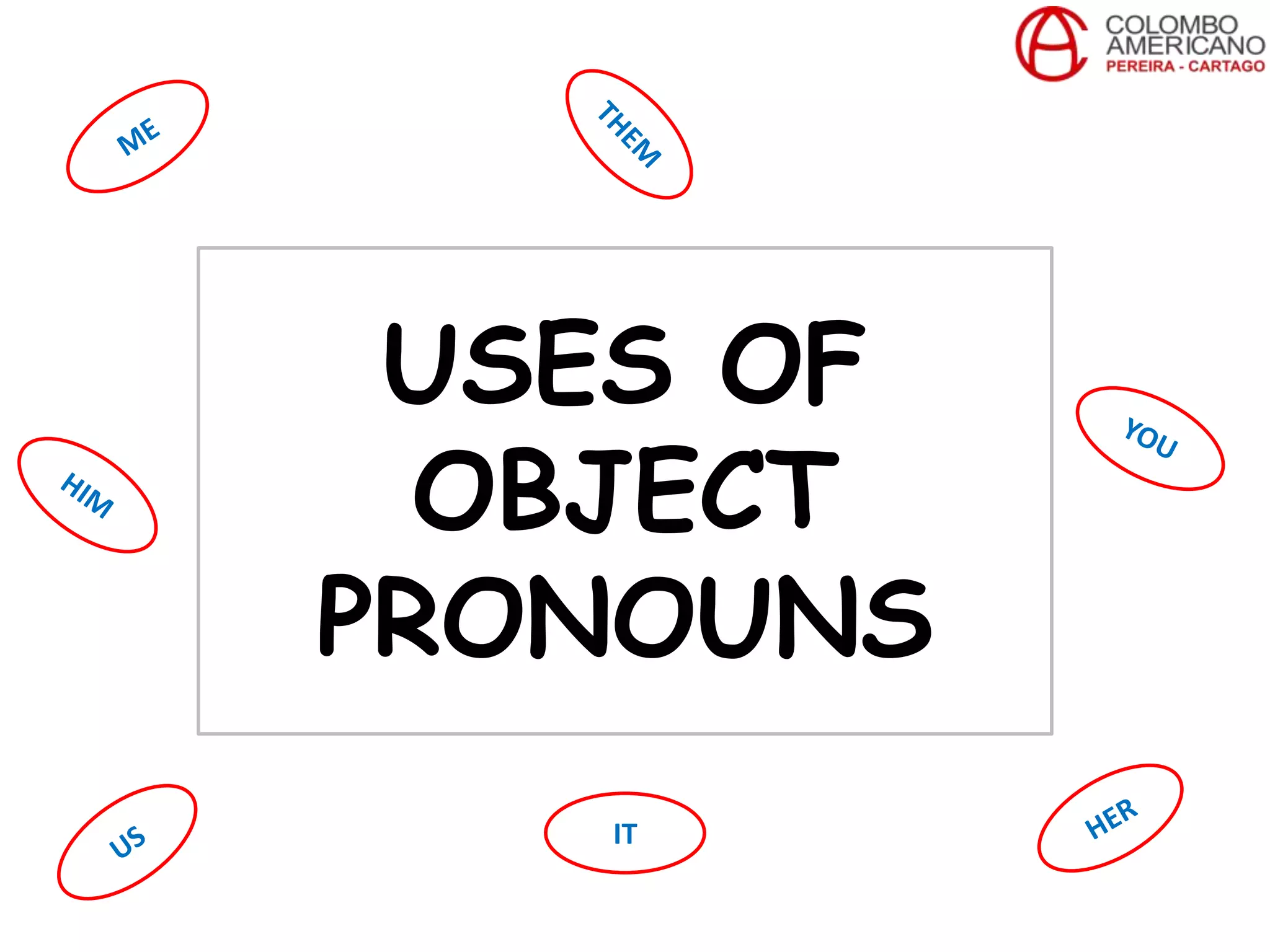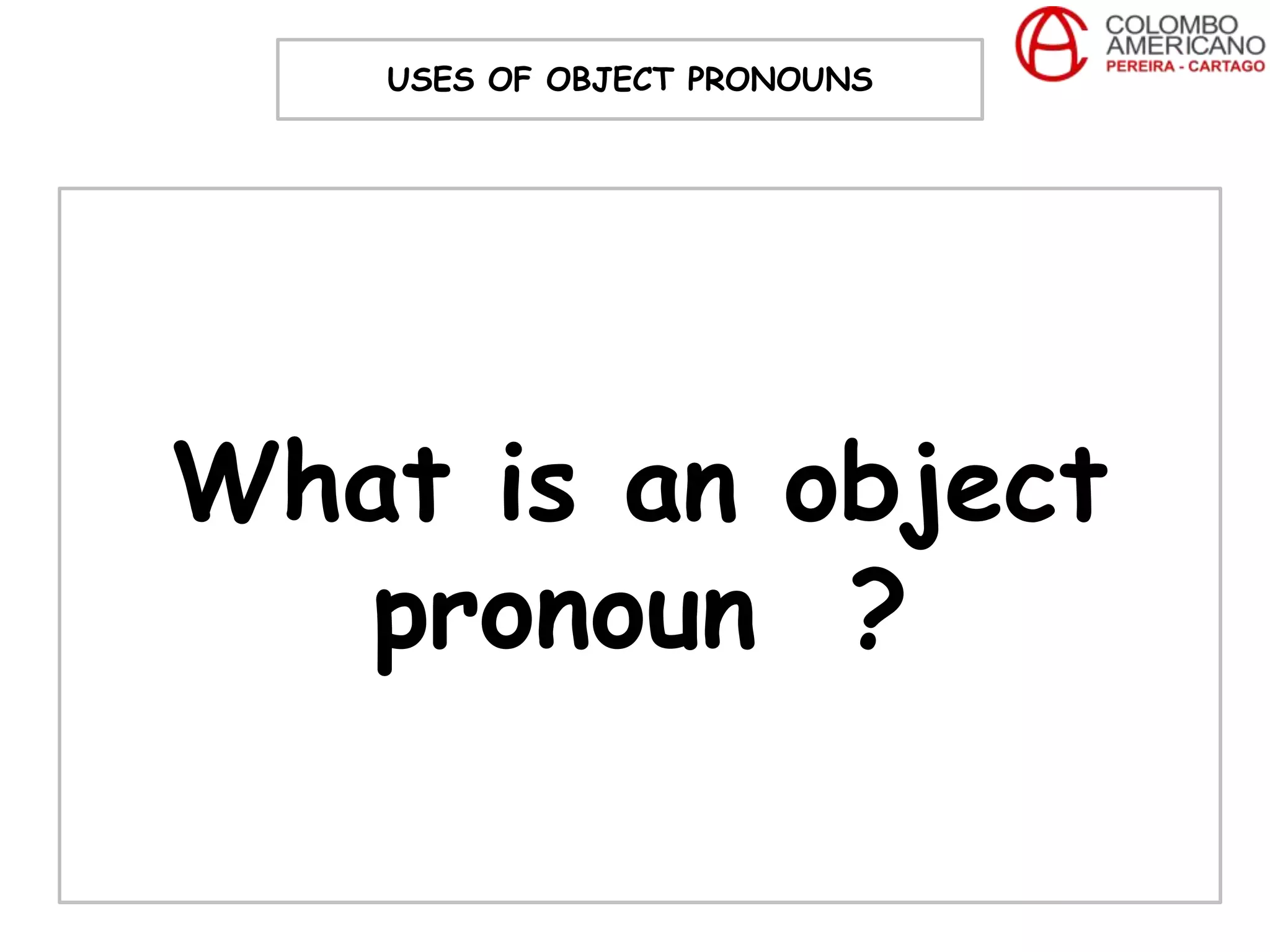 The document discusses the uses of object pronouns in English. It begins by explaining what an object pronoun is, using the example sentence "Jenny loves Jack". It analyzes this sentence to identify the action (to love), who performs the action (Jenny), and who receives the action (Jack). It then replaces the names Jenny and Jack with the subject pronoun "she" and object pronoun "him", respectively. The document continues by listing the English object pronouns and providing examples of how they can be used as direct objects and within prepositional phrases.