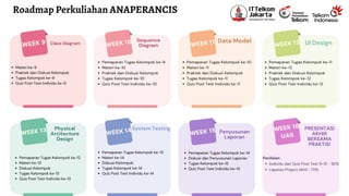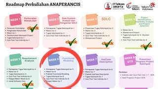 Dokumen ini membahas analisis dan perancangan sistem informasi, termasuk metodologi pengembangan perangkat lunak dan pemodelan fungsional dengan diagram UML. Materi mencakup siklus pengembangan perangkat lunak, metode yang digunakan, serta penggunaan diagram use case dan activity untuk menggambarkan proses bisnis. Tujuannya adalah untuk membantu mahasiswa memahami kebutuhan dan spesifikasi sistem serta mendukung pengembangan perangkat lunak yang berkualitas.
