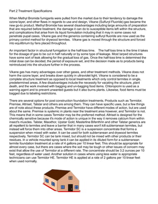 2) For drywood termites, fumigation using sulfuryl fluoride gas is often the best treatment as it kills termites in both visible and hidden areas. Local treatments involve drilling holes and injecting wood with pesticides.